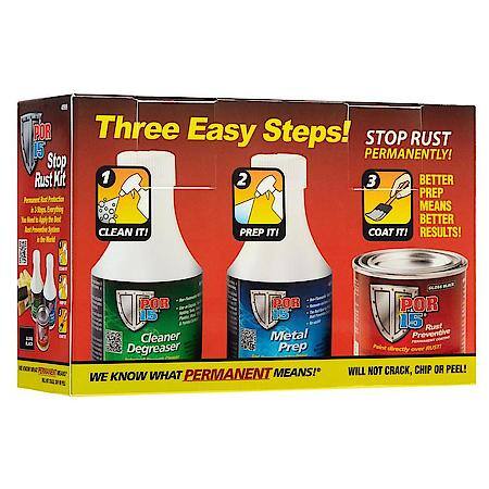 POR-15 Stop Rust Kit. Stop rust permanently in three steps... clean it, prep it, coat it. Great for small projects. Covers a 6 square foot surface area with two coats applied. Can be used to permanently stop rust in projects involving: Small Subframes, Axle Replacements, Body Panel Repair, Control Arms, Truck Bed Repair, Brackets, Brake Shields, Backing Plates. Kit includes: 8oz Bottle POR-15 Cleaner Degreaser, 8oz Bottle POR-15 Metal Prep, 4oz Can POR-15 Rust Preventive Coating, Paint Brushes, Latex Gloves, Detailed Instructions and Tips.